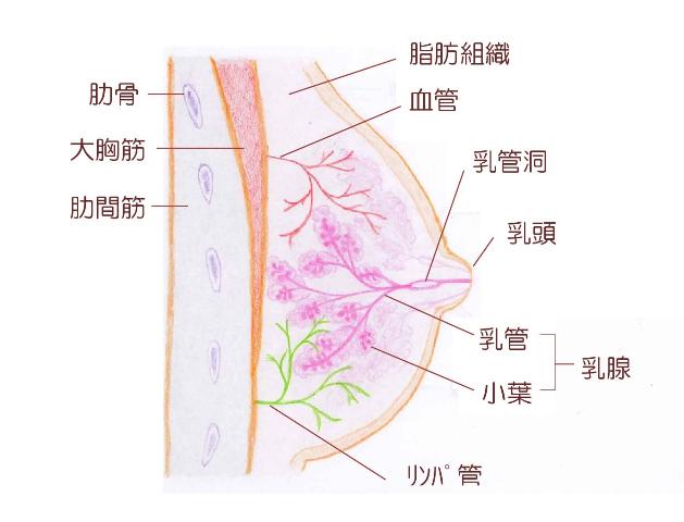乳房は出産時に乳汁を分泌する大切な役割を持つ皮膚の付属器です。その中には「乳腺」と呼ばれる腺組織と脂肪組織、血管、神経などが存在しています。 「乳腺」は乳頭から枝のように放射線状に広がり、母乳をつくる「小葉」と母乳を乳頭まで運ぶ「乳管」から成ります。
