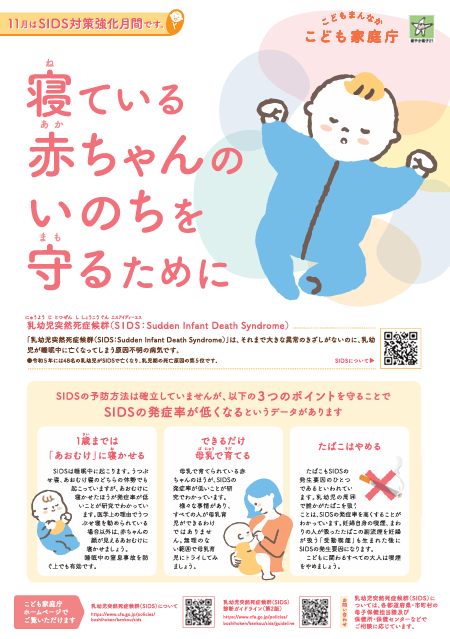 TOP お知らせ 11月は「乳幼児突然死症候群(SIDS)」の対策強化月間です 2025年11月01日お知らせ 11月は「乳幼児突然死症候群(SIDS)」の対策強化月間です <こども家庭庁_乳幼児突然死症候群(SIDS)について> https://www.cfa.go.jp/policies/boshihoken/kenkou/sids/ インフォメーション一覧へ戻る